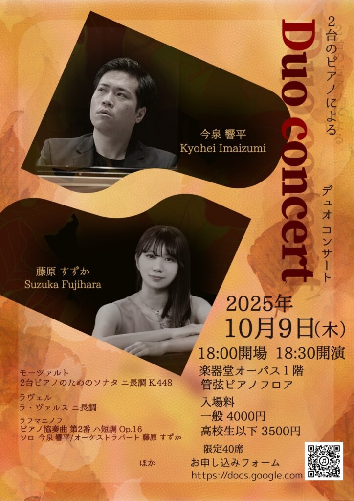 2台ピアノによるデュオコンサート プログラム モーツァルト 2台ピアノのためのソナタ ニ長調 K.488 ラヴェル ラ・ヴァルス ニ長調 ラフマニノフ ピアノ協奏曲 第2番 ハ短調 Op.16 今泉響平 (オーケストラパート:藤原) チケット 【一般】4,000円 【高校生以下】3,500円 お申し込みフォーム https://forms.gle/z8xAt8BJomvqMhXt5 Date 2025年 10月 09日 Expired! Time 6:30 PM Location 楽器同オーパス 管弦ピアノフロア 高知県