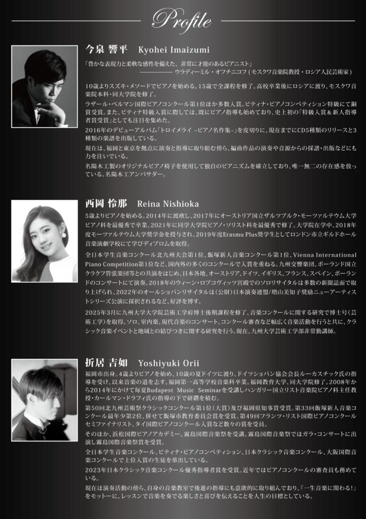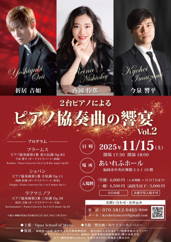 2台ピアノによるピアノ協奏曲の響宴 Vol.2 プログラム ブラームス ピアノ協奏曲第2番 今泉響平 (オーケストラパート:西岡) ショパン ピアノ協奏曲第1番 西岡怜那 (オーケストラパート:折居) ラフマニノフ ピアノ協奏曲第3番 折居吉如 (オーケストラパート:今泉) チケット 【早割】4,000円 【一般】4,500円 【学生】3,000円 Date 2025年 11月 15日 Location あいれふホール 福岡県 Website https://www.kenkou-support.jp/facilities/10f.html